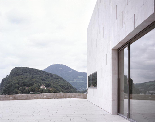 Neben der gedrungenen Vertikalen des vertrauten Wasserturms, dessen historisierendes Äußeres seit über hundert Jahren erfolgreich um Akzeptanz des camouflierten Zweckbaus bettelt, ist ein horizontal betontes Element dazugekommen. Rahmenartig fasst die zur Stadt gerichtete Ostfassade ein breites Fenster, das den Hochblickenden signalisiert, wie bequem man von dort oben herunterschauen kann. Auf sich aufmerksam macht das Bauwerk mit der massiven Verkleidung aus dem fast weißen hellen Untersberger Marmor, der aus der Nähe stammt und, von nahe besehen, feine rote Äderungen aufweist. Modisches Schwarz hätte den Bau verschwinden lassen; doch wäre das gescheit gewesen? Schließlich sollen Besucher darauf aufmerksam gemacht werden, müssen sie doch mit dem Lift hinauffahren. Und besser als falsche Aufgeblasenheit ist moderne Klassizität allemal. Die neun Zentimeter starke Vormauerung weist Körper und Masse auf, und der lagerhafte Steinschnitt vermittelt Klassizität, subtil gebrochen durch die aufgeraute Oberfläche und ein nach Musikthemen mathematisch umgesetztes Muster schmaler Vertikalschlitze, die der Entlüftung dienen.