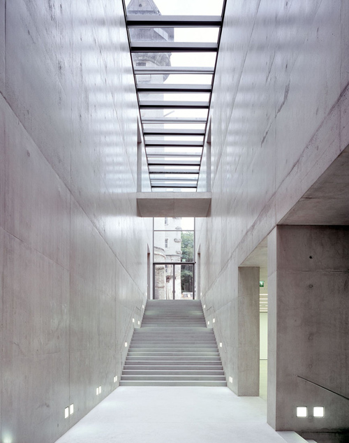 Die flach in die Decke eingesetzten Oberlichter beruhigen deren Wirkung, so dass von dort kaum eine visuelle Störung ausgeht. Etwas schwieriger ist es in den unteren Geschoßen mit dem Kunstlicht, das aus stark präsenten, parallelen Leuchtbalken an der Decke kommt. Aber da das Museum nicht streng als neutraler weißer Raum ausgelegt ist, ist dies ein Nebenaspekt in der attraktiven räumlichen Vielfalt, die mittels zusätzlicher Wände variiert und für kleinere Formate und Bildkombinationen anders definiert werden kann.