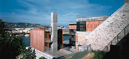Eine Treppenkaskade, die die Topographie suggestiv betont, führt über zwei Terrassen hinunter zum Eingangshof - vorbei am kubischen Ostflügel. Dieser in Nordsüdrichtung transparente Solitär aus Beton, Stahl und Glas dient dem Studium der grossen Meereskarten. Treppen, Relings und ein als minimalistischer Schiffsmast gestalteter Kamin aus Beton machen das Gebäude zu einer maritimen Metapher, während die holzverkleideten Seitenwände die von der «boucane» evozierte Hafenatmosphäre diskret unterstützen.