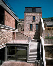 Als Bauplatz zur Verfügung stand am Fuss eines steilen, aus den Klippen hervorgewachsenen Hügels ein altes, «la boucane» genanntes Gebäude, das einst eine Fischräucherei beherbergt hatte, und darüber - auf einer Gartenterrasse thronend - ein Haus von Guy de Maupassant. An diesem bedeutungsvollen Ort, an dem sich Fécamps Wirtschaftsgeschichte mit Frankreichs Hochkultur vereint, versuchte Etienne - ganz ähnlich wie Tschumi in Tourcoing - die Spuren der Vergangenheit mit Hilfe heutiger Architektur systematisch herauszuarbeiten und neu zu interpretieren.