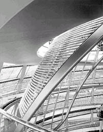Foster gelang es, seinen Bauherrn von der anfangs gewünschten Rekonstruktion der alten Kuppel abzubringen und von einer Lösung zu überzeugen, bei der Plenarsaal und Kuppel zu einer über 40 Meter hohen vertikalen Sequenz zusammenfaßt sind. Diese Lösung ist auf den ersten Blick simpel: Der Plenarsaal wird mit einem Glasdach gedeckt, darüber sitzt die Kuppel als leichter, verglaster Stahlkorb. An dessen Innenseite entlang führen zwei öffentlich zugängliche Rampen zu einer Aussichtsplattform, die frei in den Kuppelraum gehängt ist – eine Anordnung von einigem symbolischen Witz: Wenn das Volk über die Rampe zur Aussichtsplattform aufsteigt, ist es für die Parlamentarier stets präsent und kann ihnen umgekehrt durch die Glasdecke bei der Arbeit zusehen.