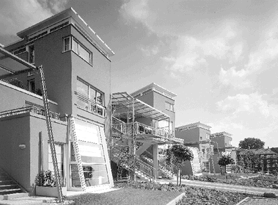 Die Wohnanlage ist übrigens nur teilweise für den Verkehr gesperrt, und es gibt keine Tiefgarage. Die Autos werden entweder in „Taschen“ unter den Wohnhäusern abgestellt oder unter recht plastisch formulierten Flugdächern zwischen den Wohnbauten. Das mag auf Anhieb problematisch klingen. An Ort und Stelle merkt man aber, daß die Wohnqualität darunter nicht leidet.