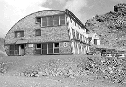 Glaser hat die logistisch diffizile Aufgabe mit Vorfertigung der tragenden und bekleidenden Wand-, Decken- und Fassadenteile im Tal, mit Hubschraubertransport und Endmontage auf der präzis vorbereiteten Bodenplatte gemeistert. - Bei einem Bauwerk in dieser Extremlage und im Kern eines Nationalparks gewinnen Überlegungen zur Umweltverträglichkeit bedeutenden Einfluß auf die Gestalt. Alle Aufenthaltsräume sind zur Sonne orientiert, während die Nebenzonen im Nordosten liegen. Der Eingang an der dem Sattel zugewandten Schmalseite führt in einen geraden Gang, an dem im Erdgeschoß Gastraum und Küche liegen, sich in den Obergeschoßen einerseits die Schlafräume mit jeweils 16 Lagern, andererseits die Sanitärräume reihen. Die Treppen fassen die Erschließung zu einem dreigeschoßigen, durch seine Größe sowie seine Materialisierung in unbehandeltem Sperr- und Massivholz stimmigen Aufenthaltsbereich zusammen.
