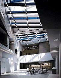 Der zentrale Erschliessungsraum weitet sich zur Cafeteria.