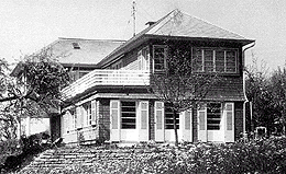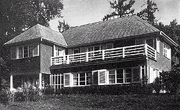 Das in pflaumenrotem Eternit verschindelte Holzhaus bildet ein dichtes Konzentrat bürgerlicher Wohnkultur mit deutlichen reformerischen Ansätzen in einem durchdachten, polyvalenten Grundriß. Der Eingang wird an der Nordseite von einem kleinen, außermittig plazierten Risalit signalisiert, der zugleich ein kurzes Vordach bildet. Von dem großzügigen Windfang führt eine breite Türe geradeaus in die Wohnhalle und eine schmale Pforte rechter Hand in den Wirtschaftsteil mit der Küche. Links von der Halle schließt eine von Lux Guyer entwickelte Zimmer-Bad-Zimmer-Kombination an, bei der die beiden großen Flügeltüren des Bades in zwei Positionen fixiert werden können, sodaß tagsüber zwischen den Kinderzimmern ein Spielbereich offen bleibt. Große Fenstertüren führen von den Zimmern ins Freie - Lux Guyer vertrat die Meinung, jedes Kind solle über einen individuellen Gartenbereich verfügen.