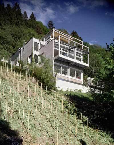 Das Eintreten ist ein Raumerleben der Sonderklasse. Bis zum Dachfirst weitet sich das Innere hier in einem fulminanten Luftraum von 9 m Höhe, zwischen die lapidar gesetzten Flachstahlstufen der Innenstiege flutet Licht, man blickt durch die gartenseitige Glasfront zum elterlichen Altbau. Die Innensicht des raumbildenden Steildachs aus Ytongfertigteilelementen zwischen Stahlrahmen geht als eine Fläche in die Wand über.