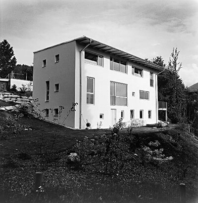 Als geschlossener, zweistöckiger Baukörper von 8 m x 17,5 m mit integrierter Garage fasst der vertraute Haustyp in kühler Verfremdung den Straßenraum ein. Traufenlos, mit innenliegender Dachentwässerung wirkt er in seiner flächigen Struktur mit der grauen Ziegelsteindeckung wie ein Stück abstrakter Geometrie. Als raumhohe, plane Glasscheiben wurden die Fenster flächig eingeschnitten, auf ihre Funktion als beschattende Vordächer reduziert, kragen brüstungslos zwei fassadengraue Betonscheiben aus den Schmalseiten des Hauses. Balkone braucht es am Land keine, wer Natur will, geht in den Garten.