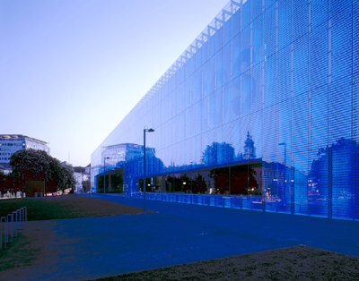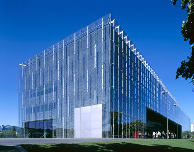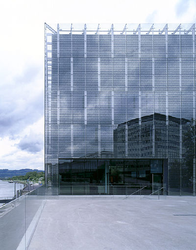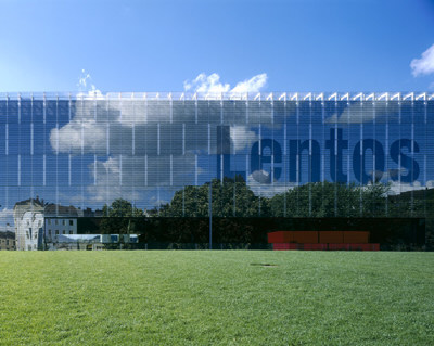 Die gläserne Außenhaut hält, was das Wettbewerbsmodell an Abstraktion versprochen hat. Darüber hinaus aber kann sie hier an der Kante zwischen der Stadt und dem Fluss etwas leisten, das die modebewussten Schwestern in den Innenstädten kaum zustande bringen: sie spiegelt den Himmel, das Wasser, das Grün des Donauparks in die tausendfach auf das Glas gedampften Schriftzüge aufgelöst wider. Sie legt dem Haus ein Kleid aus Landschaft an und lässt die Stadt den Atem des Flusses schöpfen.