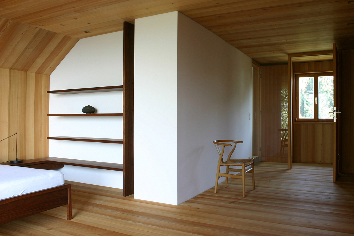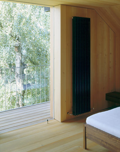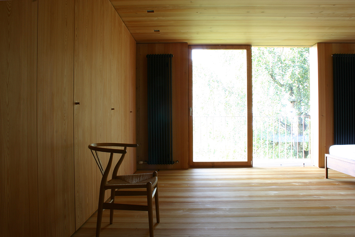 Der Eingriff im Dachgeschoss wird straßenseitig lediglich durch einen Lichtbrunnen sichtbar, der mit seinem Volumen und der Verkleidung mit grauen Schindeln den Typus des Kamines verkörpert und somit die Fläche des Daches nicht zerstört. Auf der Gartenseite wendet sich das Haus nun mit einer großzügigen Glaskonstruktion dem Panorama zu. Das zarte Edelstahlgeländer des davor liegenden Holzbalkons und die auf ein Minimum reduzierten Profile der Balkontüre wie der scheinbar schwellenlose Übergang des Zimmerbodens ins Freie verstärken den Zusammenhang zwischen Gebäude und Landschaftsraum.