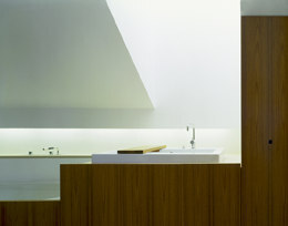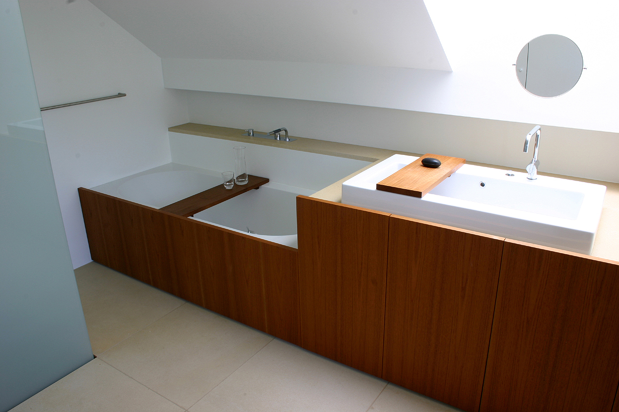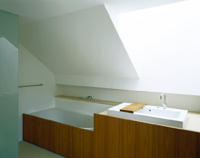 Der hinter dem Balkon liegende Schlaf- und Wohnraum ist zur Gänze in Lärchenholz gefasst. Ein Einbauschrank über seine gesamte Tiefe egalisiert die in Dachräumen oft anzutreffende Unregelmäßigkeit des Grundrisses. In ihrer liebevoll-präzisen Ausarbeitung führt die hier verwirklichte Detailarbeit fort, was in den erhaltenen Teilen der historischen Einrichtung wie beispielsweise der alten Küche noch zu spüren ist. Auch der zweite Raum des Dachgeschosses, das in die Helligkeit des straßenseitigen Lichtbrunnens getauchte Bad aus Naturstein und Holz ist vom gleichen Geist inspiriert: von profunder Kenntnis des Handwerkes und der Liebe zum Material.