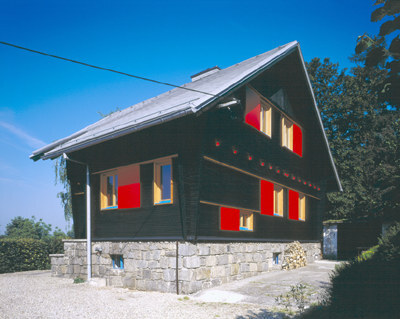 Aus mittlerweile fast schwarz gedunkeltem Holz errichtet, erhebt es sich eingeschossig auf einem Sockel aus Natursteinen über dem steil abfallenden Hang. Unter dem orthogonal zur Straße ausgerichteten Satteldach haben noch einige kleine Räume Platz gefunden, die zum Zentrum einer umfassenden Sanierung des Hauses werden sollten. Der Architekt Gerhard Fischill aus Puchenau hat sich des Dachraumes angenommen und dessen Adaptierung an modernen Wohnkomfort mit einer neuen Deutung des gesamten Gebäudes verknüpft. Seine Interpretation hält sich allerdings eng an das Original, ohne auf eine diskrete Dokumentation der technischen und gestalterischen Veränderungen im Laufe seiner Geschichte zu verzichten. So lebt das ursprüngliche Farbkonzept vom Kontrast des dunklen Holzes zum roten Dach, der mit dem blitzenden Blau der Fenstersprossen, dem Rot der Fensterrahmen und dem Gelbton der Klappläden beträchtlich aufgefrischt wurde. Der gelbe Holzton wird jetzt von den Rahmen und Stöcken der neuen Fenster übernommen, die Sohlbänke erstrahlen blau und die Fensterläden rot. Es sind Schiebeläden, die mit ihren Führungsbalken die Fassade um ein zusätzliches gliederndes Element bereichern.