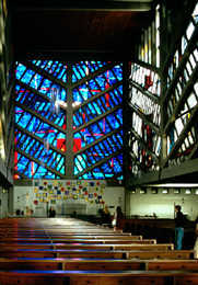 Der Ambo als „Positionszeichen“ für den Wortgottesdienst (linkes Seitenschiff) stammt von Franco Fonatti und Helmut Hempel (1986), die Glasfenster wurden von Giselbert Hoke entworfen.