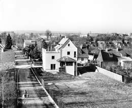 Die Landschaft im Südosten Wiens ist - im Gegensatz zum hügeligen Westen - eben und gleichförmig. Das Grundstück liegt in einer noch weitgehend einheitlichen Siedlung der 40er Jahre. Es grenzt an eine Geländestufe mit einer fast 12 m hohen grasbewachsenen Böschung, auf deren Krone sich eine Baumreihe befindet. Sie bildet die einzige nichtbebaute Aussichtsseite. Die konische Form des Doppelgrundstücks schafft eine perspektivische Längsachse zur Böschung hin, auf die der Hausgrundriss durch eine leichte Verdrehung des Ostteils eingeht.