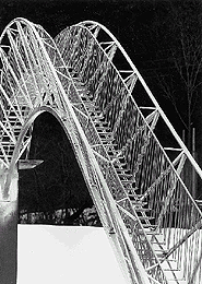 Das Tragwerk besteht aus dem bogenförmig geschwungenen Untergurt, einem Profilrohr von 150 mal 150 Millimetern. Von diesem aus streben die Dia-gonalen paarweise V-förmig zu den beiden Obergurten aus 80-er-Rohr. Der etwas kräftigere Untergurt mit Kastenquer-schnitt übernimmt die Torsions-beanspruchung, betont aber auch die Grundform der Bogen-brücke, während die langen Diagonalstäbe zusammen mit den Obergurten eine hohe Steifigkeit bewirken.