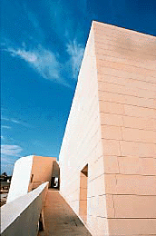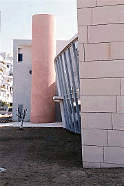 Gibt sich die Verschränkung der schwungvoll gekurvten Eingangshalle mit dem schräg in den Boden abgesenkten sandgelben Theatermonolithen leicht dekonstruktivistisch, so erinnert das über pilotis schwebende kalkgraue Gästehaus mit Rampe und Bandfenster an die Villa Savoye von Le Corbusier. Der hinter dem Eingang sich erhebende rosafarbene Liftturm schliesslich evoziert surrealistische Assoziationen, gemahnt aber auch an Dani Karavans frühes Meisterwerk: das Negev-Denkmal in Beerscheba.