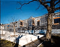 Das eigentliche Meisterwerk von Devanthéry und Lamunière ist aber ein im Mai 1996 eingeweihtes Schul- und Freizeitzentrum in der vom Autosalon her bekannten Genfer Vorstadt Le Grand Saconnex. Der Neubau steht an der schmalen Route de Colovrex im Spannungsfeld zwischen dem eng verschachtelten Dorfkern, der baumbestandenen Rathaus-Bastion und biederen Wohnblöcken. Dieses städtebauliche Gewebe und den gebauten Kontext analysierten Devanthéry und Lamunière mit viel Gespür. Die Firsthöhe der Nachbarbauten respektierten sie, indem sie den Schultrakt um eine Etage absenkten und dadurch einen sicheren Aussenraum für die Kinder schufen. Das Freizeitzentrum hingegen öffneten sie mit einem Vorplatz hin zur Strasse.