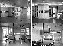 An der einen Seite schließen ein Sanitärraum und die Küche an; an der anderen sind drei sechseckige Kojen angelagert, die jeweils auf zwei Stockbetten vier Schlafplätze enthalten, sodaß der ganze Pavillon für zwölf Jugendliche ausgelegt ist.