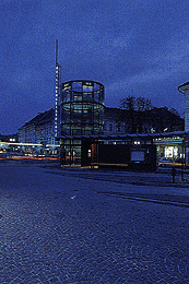 Der Heiligengeistplatz stand in den letzten Jahren im Zentrum heftiger Diskussionen. Lange Zeit waren die Busse über den gesamten Platz bis vor die Heiligengeistkirche verteilt, in der Lebendigkeit des Ortes grenzten profane und sakrale Funktionen hart aneinander. Insgesamt bestand also das vertraute Bild eines ausschließlich dem Verkehr dienenden Platzes, und Busbahnhöfe dieser Art üben einen eigenen Reiz aus. Begrenzt wurde der Bereich zum Park hin von einem ebenerdigen, elegant geschwungenen Pavillon mit Flachdach, in den fünfziger Jahren erbaut und somit aus einer Zeit, die bereits ihre Renaissance erlebt.