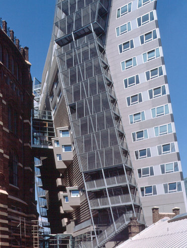 Hinter den Fassaden ist nicht viel übrig geblieben von den rund 75 Meter hohen Gasometern. Immerhin bilden sie eine kreisrunde, weithin sichtbare Kulisse am Südostrand von Wien, die von den Architekten zu füllen war. Doch damit nicht genug der urbanen Lebenszeichen: Coop Himmelblau haben zusätzlich noch an der Nordseite eines Gasometers ihre geknickte und gewölbte Wohn- und Bürowand angedockt, die reichlich pathetisch verkündet, dass sich die Architektur nicht nur den Zwängen eines der europaweit grössten Sanierungsfälle unterwirft. Diese Zwänge sind beachtlich, wenn man sich den Umgang der Architekten mit der Kreisform anschaut. Insgesamt darf man den Bewohnern, vor allem in den unteren Etagen, möglichst viele Sonnentage wünschen, denn die Belichtung reicht bei trübem Wetter schlichtweg nicht aus.