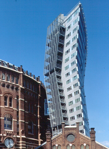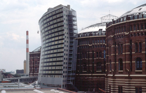 Nur Wilhelm Holzbauer entschied sich für die Mittenhinein-Bebauung und setzte einen sternförmigen Baukörper mitten in die Tonne, der den Innenraum in drei grosszügige Gärten unterteilt und die Gasometerwand nicht berührt. Eine spektakuläre Abweichung von der Ringbebauung erlaubten sich Coop Himmelb(l)au: sie bauten zusätzlich ein von weitem sichtbares, 18-geschossiges Schild an die Nordseite ihres Gasometers. In den oberen Stockwerken finden sich Wohnungen und Büros, die über eine grosszügige, jedoch nach Norden orientierte Glasfassade mit Loggien belichtet werden.