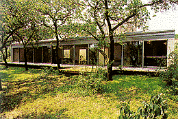 Der Hauptwohntrakt des uns interessierenden unteren Hauses zieht sich erdgeschoßig quer über die ganze Grundstücksbreite und ist südseitig durchgehend verglast. Während das Entree und das Elternzimmer mit seiner herrlichen Aussicht auf das Donautal noch im oberen Baukörper liegen, reihen sich unten Kinderzimmer, Wohnraum, Eßplatz und Küche an einen großzügigen, rückseitig anschließenden Gang mit Oberlichtdecke. Die an der vorderen Breitseite offene Schachtel ist hinten in einen Feldrain eingetieft, sodaß fast nur die Vorderfront zu sehen ist.