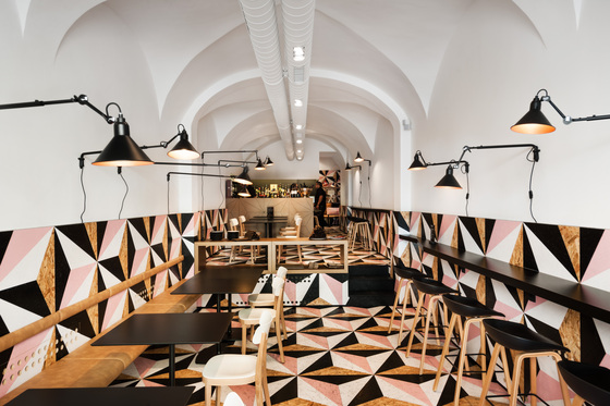 Zuletzt war dieses traditionelle Kaffeehaus heruntergekommen. Das Portal wurde in den fünfziger Jahren von seinen Bossen befreit, belanglos war auch das Innere. Sepp Fischer und Andrea Lechnitz ließen sich als neue Eigentümer und bereits erfolgreiche Gastronomie- Anbieter von diesen Widrigkeiten nicht täuschen. Der Standort macht einen radikalen Umbau zu einem Schaufenster und einer Rückzugsnische für eine sich als schick einschätzende Stadtjugend plausibel.