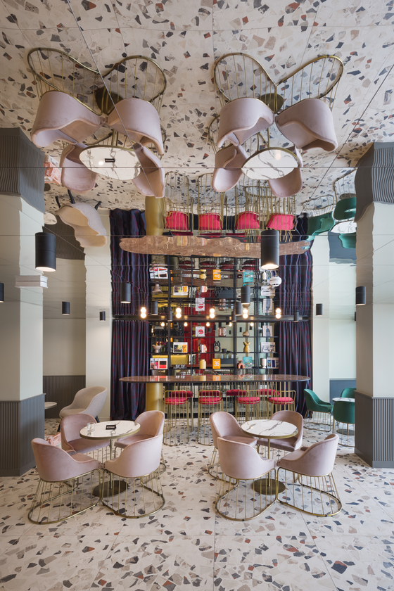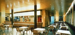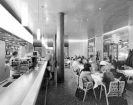 Die Realisierung ist mehrschichtiger ausgefallen, wenn auch nicht ganz ausgereift in der Wahl der Materialien. Das Kunstlicht unterstützt die funktionale Zonierung und verdeutlicht das Bekleidungsprinzip. Die verglasten Wandpfeiler holen den Straßenbetrieb in das Innere und replizieren das Verkehrsgeschehen. Die Möblierung mit quadratischen Tischen und den wiederentdeckten Sesseln Roland Rainers ist stimmig, weil sie nicht ostentativ Designobjekte präsentieren will, sondern sich zweckdienlich dem Gesamteindruck unterordnet.