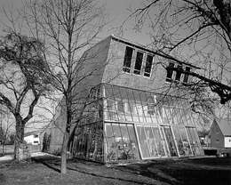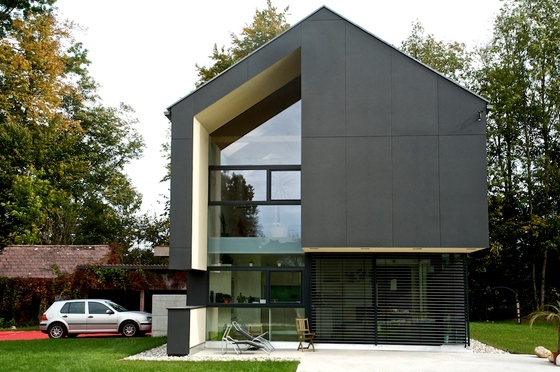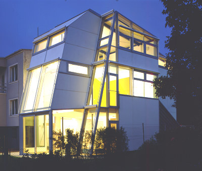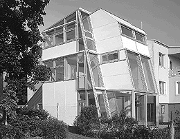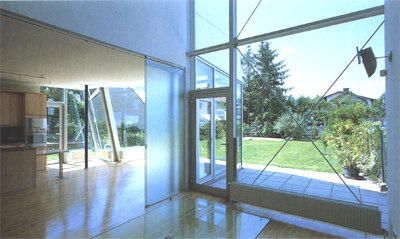 Und mitten in solcher Idylle dieses Haus. Eine Überraschung! Es kommt einem vor, als wäre ein unbekanntes Flugobjekt hier notgelandet. Das Haus hat keine Putzfassade, kein Satteldach, keine Plastikfenster, und Thujenhecke habe ich auch keine entdeckt. Dafür zieht sich straßenseitig eine Art ãGlasbandÒ wie ein Reißverschluß die Fassade hinauf, als wäre das Haus aufgeschnitten. An der plastisch formulierten Gartenseite im Westen signalisieren große Glasschiebetüren direkten Bezug nach draußen.