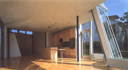 Man betritt es von der Straße im Osten und bemerkt flüchtig den verglasten ãSchnittÒ, der sich über die Fassade hinaufzieht. Welche Bewandtnis es damit hat, merkt man erst drinnen: Das Motiv des ãSchnittesÒ zieht sich über das Dach und bis zur gartenseitigen Westfassade. Das sorgt für schöne Lichtreflexe am Tag; nachts wölbt sich über dem Bett in einem der beiden Kinderzimmer der Sternenhimmel.Das Konzept des Hauses mutet auf Anhieb außergewöhnlich an. Die herkömmlichen Wohnvorstellungen sind in Frage gestellt.