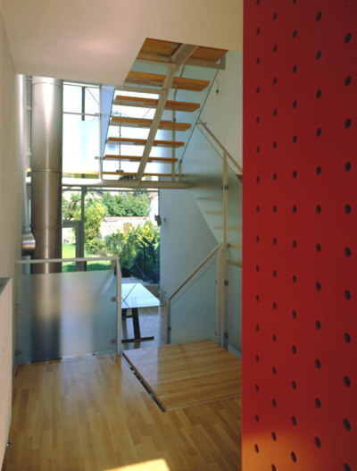 Gespräche zwischen Architekten und Bauherren ergaben, daß die Sitzgruppe hauptsächlich abends genützt wird und es unsinnig wäre, ihr den prominenten Platz hinter den Glas- schiebetüren zum Garten einzuräumen. Nachts sind alle Katzen grau, der tageslichtumflutete, zum Garten hin zu öffnende Eßplatz hat hingegen eine eigene Qualität. Man betritt das Haus also von Osten, kommt an der leuchtend roten, von den Gerners minimalistisch, dabei subtil und praktikabel gestalteten Gar- derobe vorbei und sieht schon durch bis zum Garten. Man kann durchatmen, Offenheit teilt sich mit. Linkerhand die Küche, rechts, durch eine Glasschiebetür abtrennbar, der Eßbereich. Er ist ganz zum Garten, zum Licht hin orientiert auch hier ermöglichen gläserne Schiebetüren Abgrenzung wie auch Öffnung hinaus zur Natur und hat einen zweigeschoßigen Bereich vorgeschoben.