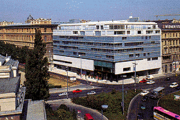 Man sieht, wie sich Roland Rainer ein Haus im großstädtischen Bereich vorstellt. Und man sieht - vis-à-vis von Secession und Akademie - den Unterschied von 100 Jahren. Es gibt keine Achsen, keine Symmetrie, das Haus ist kein Solitär und auch nicht in sich abgeschlossen. Es nimmt Bezüge auf und verwirklicht einen Lieblingsgedanken Rainers: Es setzt die Grenze zwischen öffentlichem Raum und Bauwerk außer Kraft. Das geschieht Richtung Karlsplatz durch die gedeckte Piazza mit dem U-Bahnabgang, es geschieht durch den Arkadengang um die Ecke zum Getreidemarkt. Und an der Seite zur Akademie, wo die Geschäftspassage für eine direkte Verbindung Richtung Karlsplatz sorgt und der Zugang zur „Kulturebene“ liegt, da geschieht es durch einen - über eine Freitreppe erschlossenen - gedeckten Vorplatz im ersten Obergeschoß. Über diesen Vorbereich geht es, an den Garderoben vorbei und unter der Brückenverbindung zum Kupferstichkabinett durch, in die große, zweigeschoßige Ausstellungshalle. Dort bemerkt man zunächst einige Säulen, die zum Teil statische Notwendigkeit waren, zum Teil auch die Ableitungen des Büro- und Wohnkomplexes enthalten. Und es fällt eine schöne Oberlichtverglasung auf, durch die man jetzt noch den „Hof“ darüber sehen kann; später, wenn hier der Ausstellungsbetrieb aufgenommen ist, wird diese Verglasung abgedeckt.