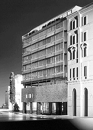 Es gehört zu Roland Rainers Credo vom „Bauen in der Altstadt“, vom „Bauen in der Großstadt“ und vom „Bauen für die postindustrielle Gesellschaft“, daß sich diese unterschiedlichen Funktionen nach außen sichtbar ausdrücken. Daher war Rainer an der Basis Schwere wichtig, darüber sollte es leicht sein, schweben, und ganz oben kam es darauf an, die Masse des Bauwerks zu relativieren. Diese Nutzungsvorgaben im Verein mit dem spezifischen Standort führten zu einer Fassadenlösung, die Einheitlichkeit bewußt vermeidet. Unten: Steinverkleidungen in Granit, im Arkadenbereich in schwarzem Labrador; darüber ein durchgehendes, schmales Fensterband, das wie ein dunkler Schlitz wirkt und von dem sich der „schwebende“ Kubus des Bürokomplexes mit seiner Haut aus Glas deutlich absetzt.