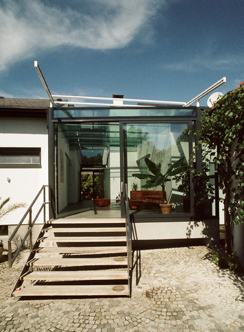 Westorientierter Eingangsbereich gegen die Abendsonne, Innenhof mit Brunnen, ostwärts gerichtete Laube im Obergeschoß und einer dem Eßraum im Süden vorgelagerte Loggia.