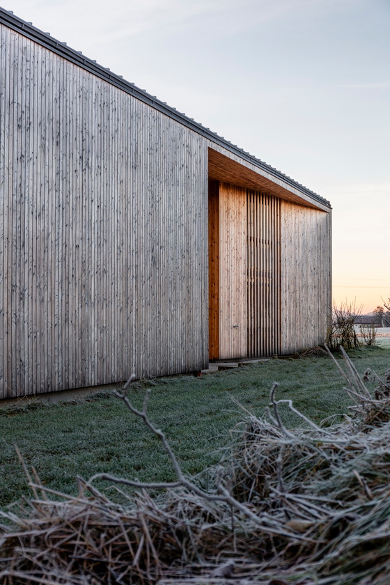 Der dritte Grund für die gewählte Bauform lag in den Beispielen der Gegend und den Gegebenheiten der Landschaft. Betont horizontal, breit gelagert und gleichförmig strukturiert wie die Umgebung selbst sollte auch der Vetterhof sein. So ehrlich wie ein altes Bauernhaus sollte er aber auch die heutigen Betriebsbedingungen zum Ausdruck bringen.