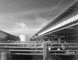 Aber der gedeckte Liegebereich der Rinder, die Lauf- und Freßzonen sind präzis differenziert. Der Fortschritt bei der Ausformung der Lebensräume der Tiere, aber auch in der Rationalisierung der Futteranlieferung und der Milchgewinnung ist anzuerkennen. Der kreisrunde Turm, in den die Kühe einzeln eintreten, um maschinell in bequemer Greifhöhe des stehenden Bauern gemolken zu werden, ist das architektonische Symbol einer überzeugenden betrieblichen Reform.