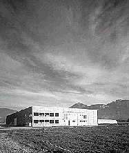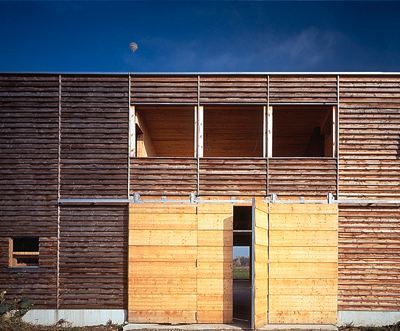 Die spürbare Ausgesetztheit und die geringe Vorbestimmtheit des Bauplatzes lassen die von Gnaiger gewählte Großform des Dreiseithofes logisch erscheinen. Der Baukörper ist zweigeschoßig und stellt sich in der Außenansicht bei einem Grundrißmaß von 30 auf 72 Meter als lagerhaft, industriell diszipliniert, der Weite der Ebene gewachsen dar. Die holzverschalten Trakte umschließen den wind- und lärmgeschützten Hofraum, der klar strukturiert, aber ebenso betont schlicht und funktionsorientiert wirkt.