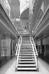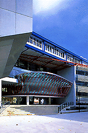 Domenig hat sich für den Haupteingang eine deutliche, unmißverständliche architektonische Geste einfallen lassen: Hier, wo das Bauwerk durchlässig ist und man über ein paar Stufen zu den Zugängen der beiden Fakultätsbereiche kommt, hier schiebt sich linker Hand eine gewaltige plastische Form - der größte Hörsaal - aus dem Gebäude heraus und im Obergeschoß die kompliziert gekrümmte, fast muschelförmige Glasfassade des Cafés.