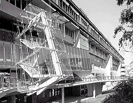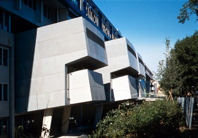 Monotonie stellt sich jedoch eben deswegen nicht ein, weil Domenig durch seine konstruktive Entscheidung zugunsten des Schwebebalkens zwischen diesen Vertikalen so viel Spielraum hatte, daß es möglich wurde, sehr differenzierte räumliche Sequenzen zu formulieren. Das heißt, zwischen die Vertikalen sind jeweils Sonderelemente eingeschoben, sehr plastisch durchgebildete, autonom wirkende „Fremdkörper“, in denen die unterschiedlich großen Hörsäle und andere Sonderräume untergebracht sind.