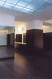 Probieren: Für die Anprobe stehen Wechselkabinen zur Verfügung, die groß genug sind, daß man sich darin bewegen und den Partner hereinholen kann. Hat man hier Sicherheit gewonnen über das Gewählte, geht es hinaus auf die platzartige Ausweitung unter dem von quadratischen Sprossen durchzogenen Oberlicht.