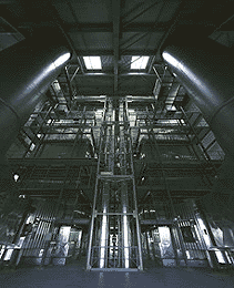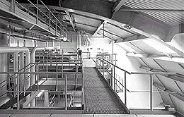 Unter der weiten Halbtonne aus Trapezblech, die von schlichten Stahlbögen getragen wird, türmen sich die Kessel in einem Geschoß unter und in sieben Geschoßen über der Erde. So komplex eine ausgereifte Anlage dieser Art heute auch ausgelegt sein möge, der sie bergende Raum ist übersichtlich, beeindruckend in seinen Tiefenwirkungen. Die Schulungs-, Büro- und Sozialräume auf den Geschoßen verblassen gegen die etwa 23 Meter hohe Halle.