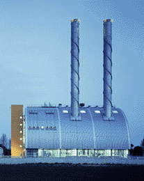 Die aus einer metallenen Haut gebildete Tonne konnotiert eindeutig Technik und Industrie, Sparsamkeit und Kompetenz, aber auch Ruhe und Stabilität. Diese Architektur versucht keine Fragen aufzuwerfen, sondern dem Betrachterinteresse gleich mit klaren Antworten entgegenzukommen. Wer Augen hat, Baukörper zu lesen, der wird die Schlitze für die Zuluft und die Abluftkamine erkennen, der wird die zwei Abschnitte mit den beiden Kesseln von jenem mit den Zonen für Pumpen, Trafos und Steuerung unterscheiden können. Die Vertikalerschließung zeichnet sich als Turm ab, und das Innere zeigt sich durch das transparent gehaltene Erdgeschoß auch von außen. Wer das Glück hat, das Kesselhaus betreten zu dürfen, wird zugestehen müssen, daß der Maschinenbau, sofern er - wie hier - einfachen, aber konsequenten gestalterischen Richtlinien unterworfen ist, hohen ästhetischen Reiz entfaltet.
