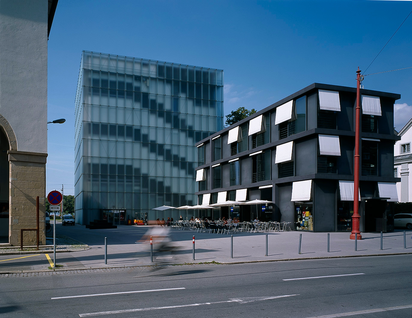 Städtebaulich ist der aus zwei Baukörpern bestehende Neubau leicht zu verstehen: Der Turm reiht sich vorn in die Front zum See, zwischen andere hohe Gebäude wie die gründerzeitliche Post und das etwas verunglückte Bühnenhaus des Kornhaustheaters aus den fünfziger Jahren. Zur Stadt hin gerichtet und bewußt eigenständig, steht der längsquadrische Verwaltungsbau des Museums. Er ist volumetrisch und bezüglich seiner städtebaulichen Lage verwandt mit den anderen Bauten dieser lockeren Zwischenzone an der Kornmarktstraße: dem benachbarten Gasthaus und der runden Seekapelle. Die beiden Neubauten fügen sich in die bestehende stadträumliche Struktur. Der Turm überragt seine Nachbarn, weil er eben ein Turm ist. Eine gedrungenere Proportion wäre einer Abschwächung der Idee gleichgekommen.