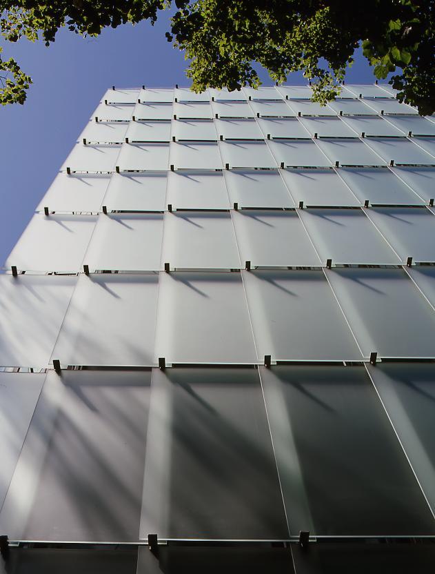 Wenn man nun auf dem Karl-Tizian-Platz vor der nach Beleuchtung und Witterung changierenden Fassade steht, rechter Hand das in Schwarz gehaltene Verwaltungsgebäude, sieht man nur die äußere Hülle aus großen, überschuppt montierten Glasschindeln.