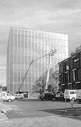 Zwischen dieser inneren Wand und der äußeren geschuppten Glashülle zieht sich ein Spalt von der Breite eines schmalen Korridors um das Bauwerk und läßt von oben Licht in die angrenzenden Bereiche des ersten Untergeschoßes einsickern. Der Raum zwischen geschuppter Hülle und Klimawand, der auch die Stützkonstruktion für die Glastafeln enthält, ist mit einer Reinigungsgondel befahrbar. Zuoberst führt ein Dienststeg um den Bau herum. - Durch die geätzten Scheiben der gläsernen Schindeln kann man schemenhaft arbeitende Menschen erkennen. Von der Stützkonstruktion sieht man nichts, da sie listigerweise hinter jenem Streifen angeordnet ist, in dem sich die Glasplatten überdecken. Nur die langen Diagonalen der Windverspannung sind als Linien zu erkennen, die der Fassade als geometrisches Proportionalnetz hinterlegt sind. Obwohl die Befestigungen der Platten sichtbar sind, verschwindet die Tragstruktur hinter dem wie Perlmutt schimmernden Glasgefieder.
