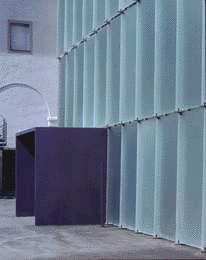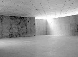 Während also die Erdgeschoßhalle von den drei Betonscheiben raumbildend gefaßt und von den doppelten Mattglaswänden schleierartig umhüllt wird, werden die Ausstellungsräume in den oberen drei Stockwerken je von einer umlaufenden Betonwand umschlossen. Die tragenden Stahlbetonscheiben stehen dazu nach innen in einem knappen Abstand, sodaß von der Halle drei Teilräume abgetrennt werden.
