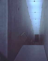 Diese lichtführende Raumschicht über dem begehbaren Raum begleitet auch die Treppe nach unten. Das Verlassen eines Stockwerks geschieht durch die kleine „Tapetentür“ aus Beton im hinteren Bereich der Tragscheibe. Nachdem sie schwer ins Schloß gefallen ist, steht man zuunterst im hellen Treppenraum, über Kopf die leuchtende Glasdecke. In drei Hüben wird man von der räumlich-suggestiven Wirkung des von zwei Absätzen unterbrochenen Stiegenlaufs gleichsam hochgesaugt, um an der gleichen Stelle auf der oberen Ebene entlassen zu werden, an der man jene darunter betreten hat oder im Erdgeschoß die Eingangshalle. Mit diesem Hinuntergreifen in den Treppenzug holt der obere Raum die Besucher bereits unten ab. Die Treppe bildet dabei den Entrakt.