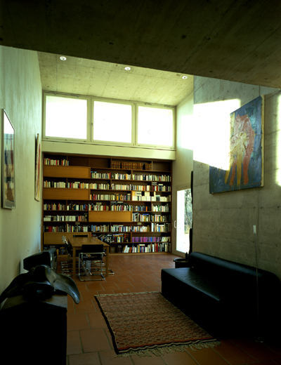 Hinter der hohen Stirnwand stehen dichtgedrängt Bücher in ihren Fächern. Darüber öffnet sich ein breites Fenster mit tief liegender Glasebene dem Südlicht, das im Winter weit in die Wohnhalle hinein strahlt. Das stark gegliederte Wohngebäude steht vorerst allein. Die langen Flanken sind geschlossen; es sind Feuermauern, an die gemäß Bebauungsplan ähnlich organisierte Häuser anschließen können.
