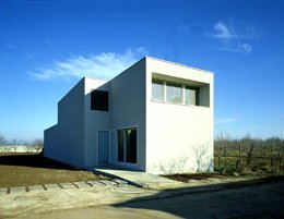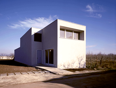 Der sinnvolle und vernünftige Schritt zurück zu geschlossener Bauweise auf schmalen Handtuchparzellen, wie er im Burgenland von alters her vertraut ist, wurde gekoppelt mit einem nach vorn, was die Disposition auf dem bebaubaren Grundstreifen betrifft, und einem zweiten - vielleicht zur Seite - in den Bereich konkreter Architektur (im Sinn konkreter Kunst) in Form einer teilweise aleatorisch erzeugten Addition von Räumen. Das Muster mag dabei unter anderem vom Streckhof entlehnt sein, ebenfalls einem alten ländlichen Bautyp.