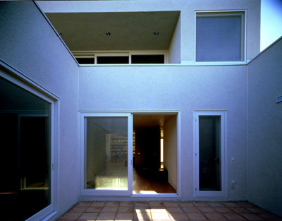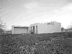 Die Eingangsachse führt durch den Vorraum, durchstößt eine Zwischenzone, zielt durch die schmale Küche und mündet in den Innenhof. Die quer über die gesamte Gebäudebreite verlaufende Zwischenzone trennt einen zum Hof gelegenen Eß- und Frühstücksbereich von der nach vorn orientierten Wohnhalle. Zugleich führt sie aber auf die andere Seite, wo eine kräftige Mauerscheibe aus glattem Stahlbeton den Beginn eines langen Korridors anzeigt. Er führt am Innenhof vorbei, wo sich wieder eine Fensterwand raumhoch öffnet, um von Westen Licht einfallen zu lassen. Es folgt eine Dunkelzone, von der die Türe zum Schlafraum abzweigt. Geradeaus leitet ein Glasabschluß in eine Art Laube über. Hier könnte ein zweiter Hof ansetzen und eine weitere Schlafzimmergruppe folgen. Vorerst öffnet sich hier das Haus zum Garten.