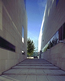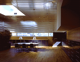 Ueber dem Lesesaal liegt ein Dachgarten mit Pausencafé für die Mitarbeiter. Der von hohen Mauern begrenzte, kontemplative Raum ist oben offen. Er betont, wie das gesamte Gebäude, die intellektuellen Vorgänge des Archivierens und konzentrierten Forschens. Denn Archivarbeit ist letztendlich Meditation auf Vergangenheit. Einige wenige Ausblicke sind bewußt gewählt, sie dienen aber nicht der Belichtung, dafür sind die hohen Oberlichte da. Die Archivbeamten verfügen über normale Büros mit Fenstern.